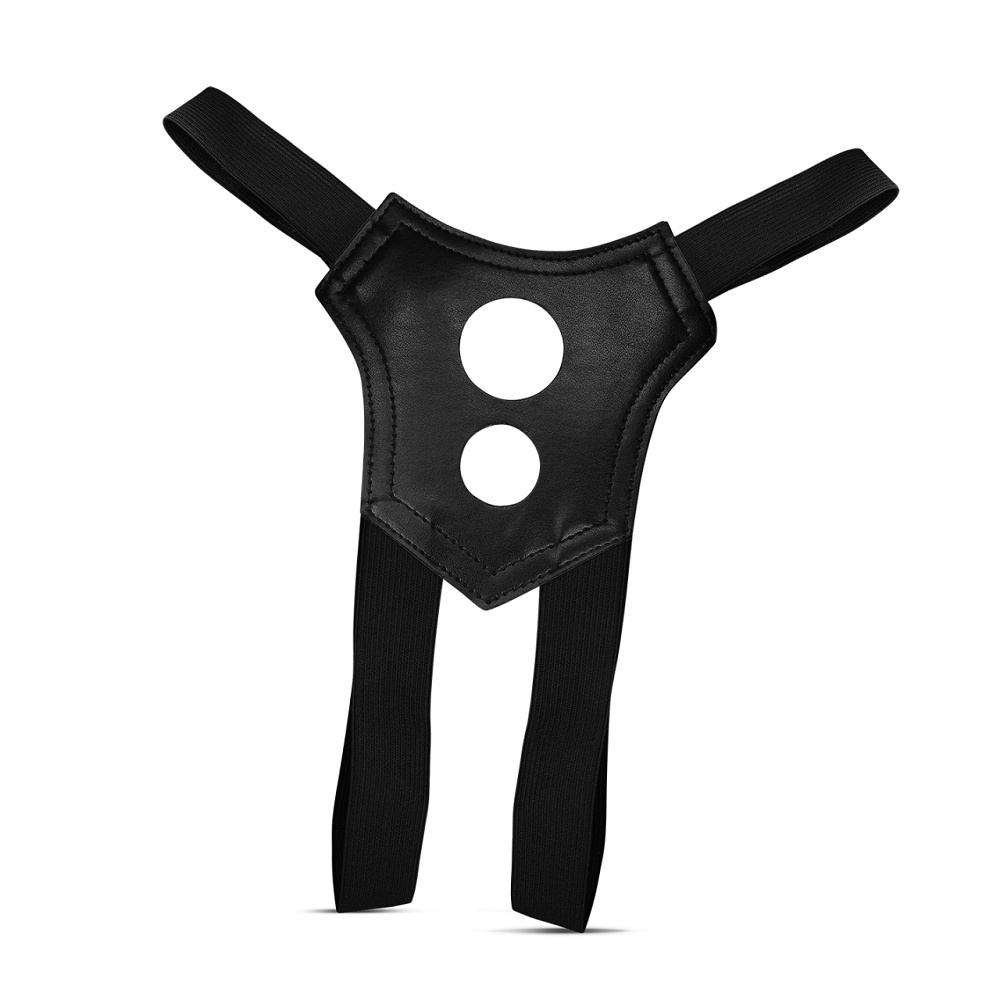 Cinta Elástica, cinta para duas próteses feita em couro sintético com tiras elásticas que se adequam aos diferentes corpos podendo ser usada como fio dental ou apoiadas nas laterais das nádegas, perfeita para casais lésbicos ou que curtem a inversão de papéis, comportando próteses de até 20cm de cumprimento. - Imagem ilustrativa.