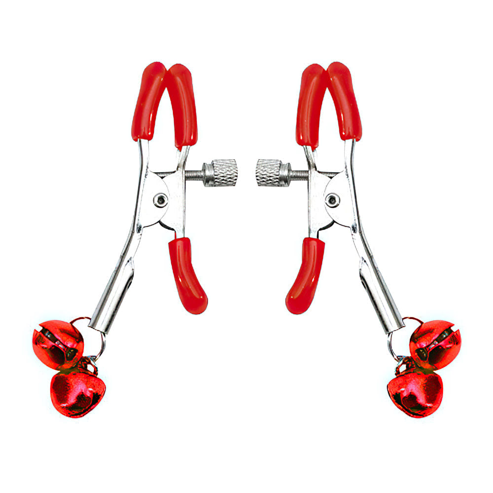 Grampos com Guizos, um acessório sofisticado e funcional projetado para adicionar um toque de excitação e estilo às suas experiências, com ajuste de pressão e pinças emborrachadas para estímulo dos mamilos e do clitóris, enquanto os guizos de metal adicionam um elemento sonoro, para atender solteiros e casais intensos inspirados nos clássicos do cinema e literatura realizando seus fetiches e fantasias eróticas. - Imagem ilustrativa.
