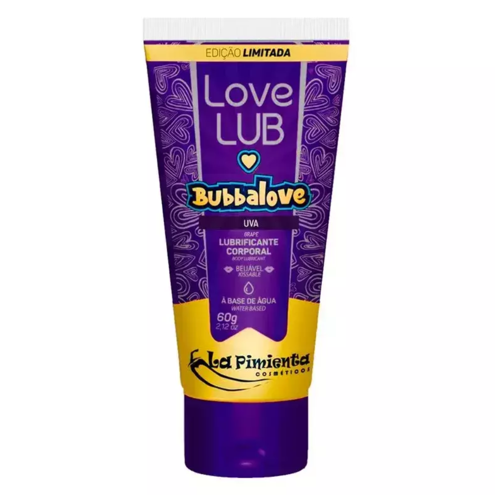 Bubbalove 60g, lubrificante íntimo beijável com sabor de uva inspirado no famoso chiclete bubbaloo, desenvolvido para a lubrificação e massagem íntima sendo especialmente formulado para proporcionar uma experiência mais sensorial, excitante e confortável com mais prazer sem incômodos, é totalmente solúvel em água e não gorduroso. - Imagem ilustrativa.